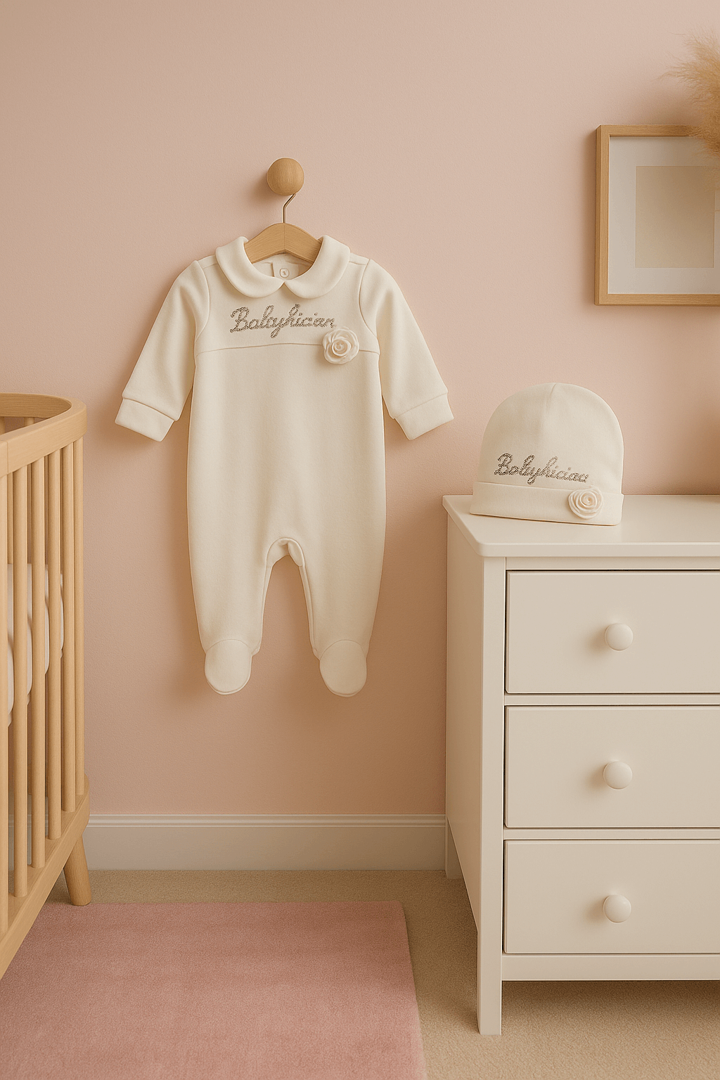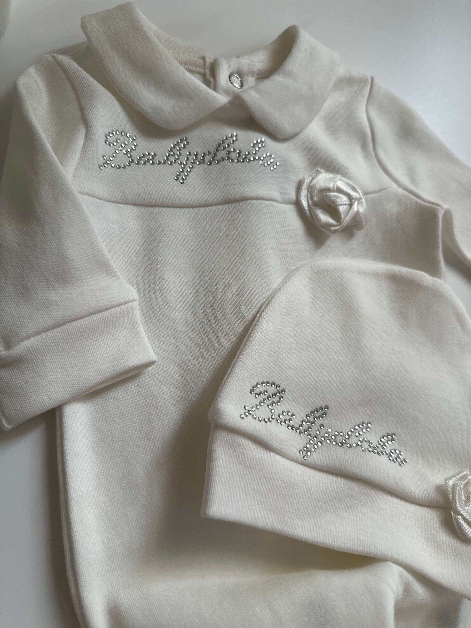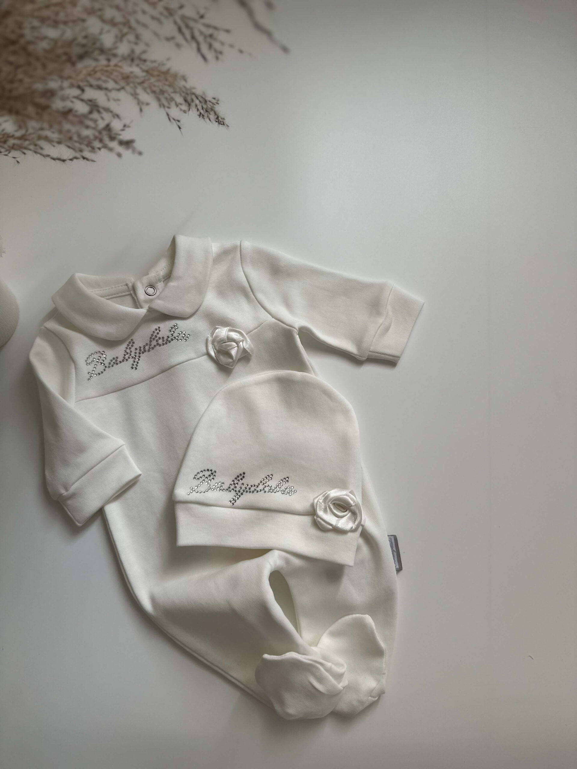 Ρομαντικό βρεφικό σετ από απαλό βαμβάκι, που περιλαμβάνει φορμάκι με γιακά και ασορτί σκουφάκι. Διακοσμημένο με διακριτικά στρας και σατέν λουλουδάκι, προσφέρει κομψότητα και άνεση από την πρώτη στιγμή. Ιδανικό για ιδιαίτερες περιστάσεις, όπως βάπτιση ή την πρώτη έξοδο του μωρού.