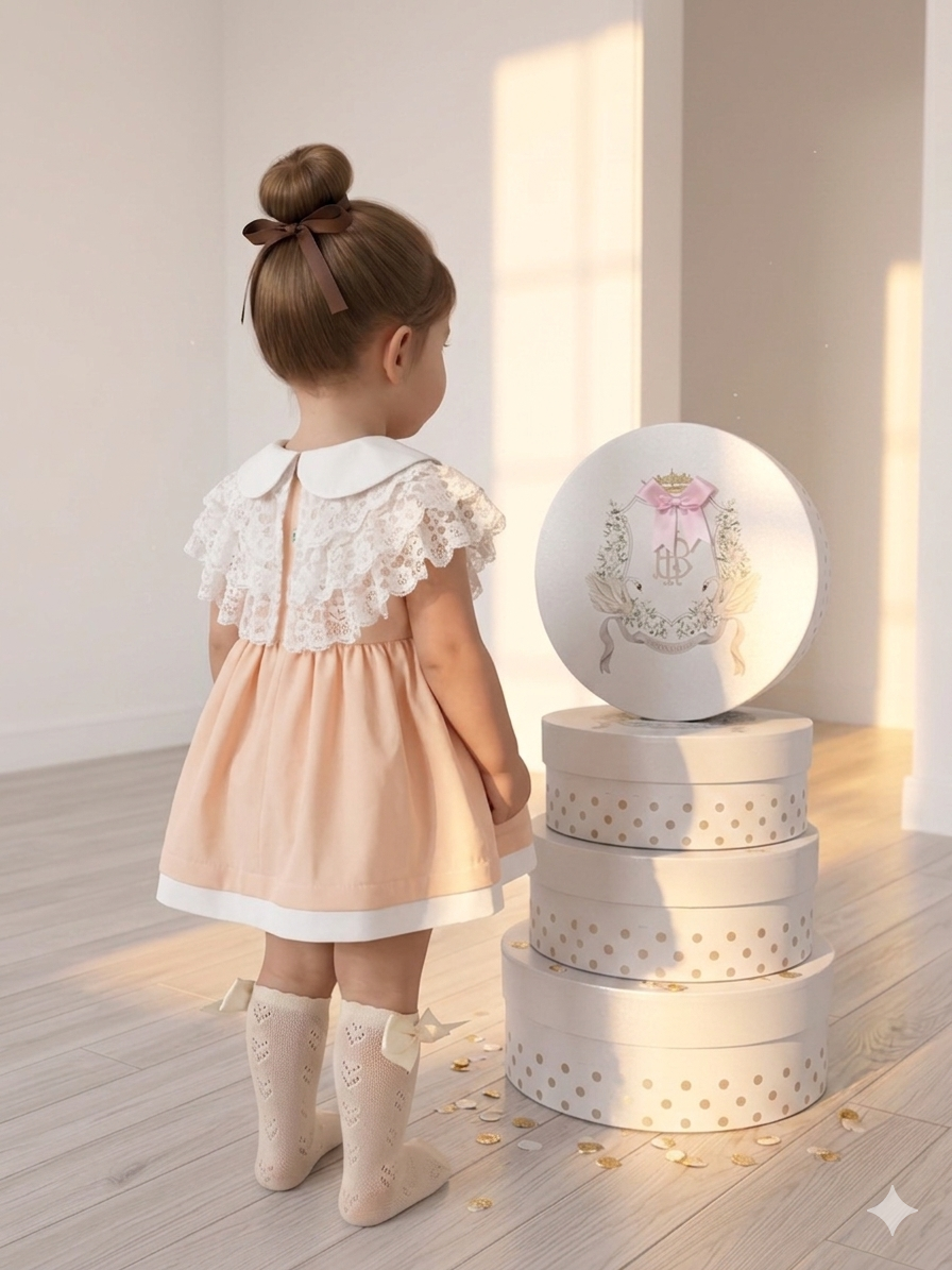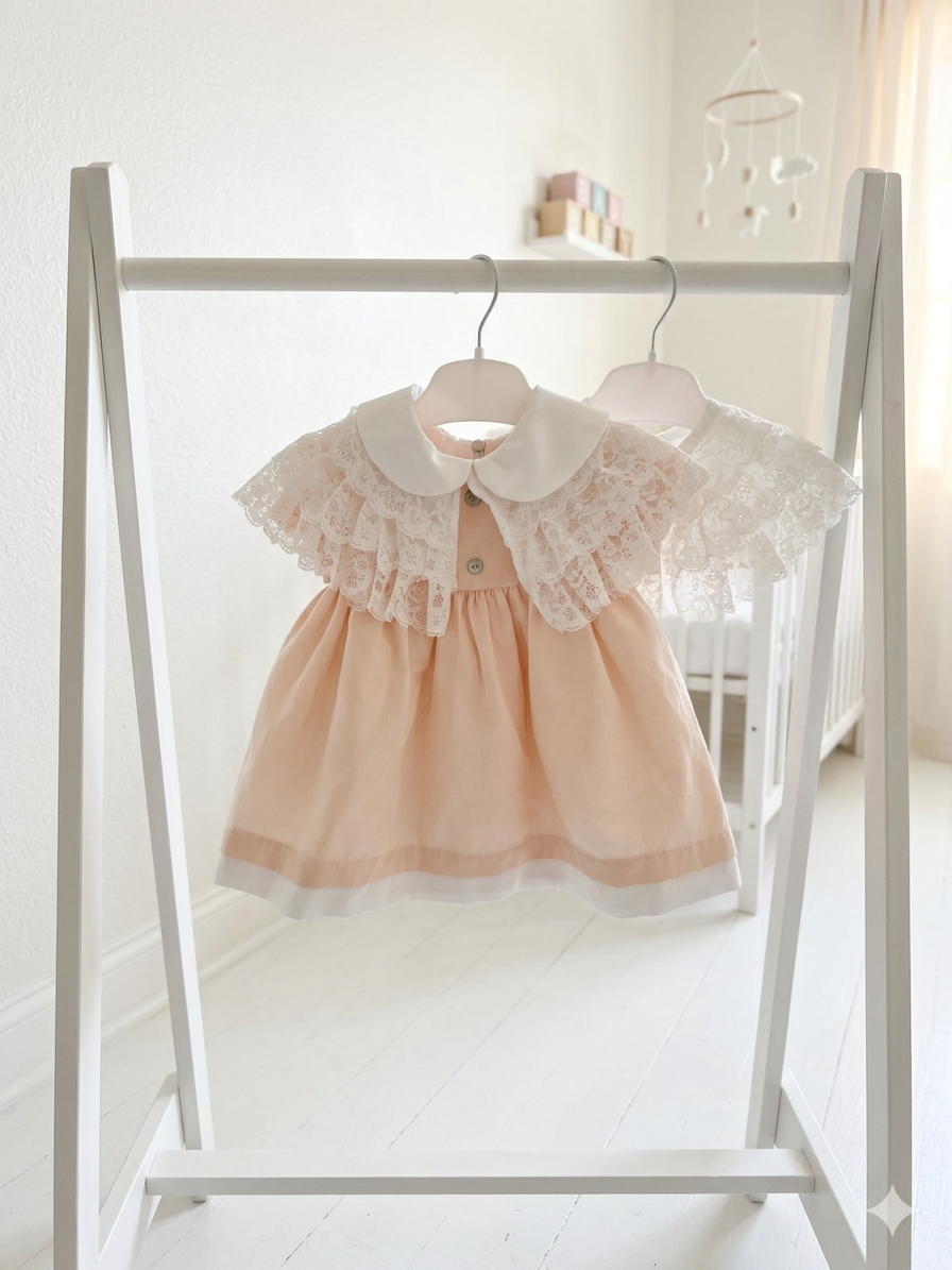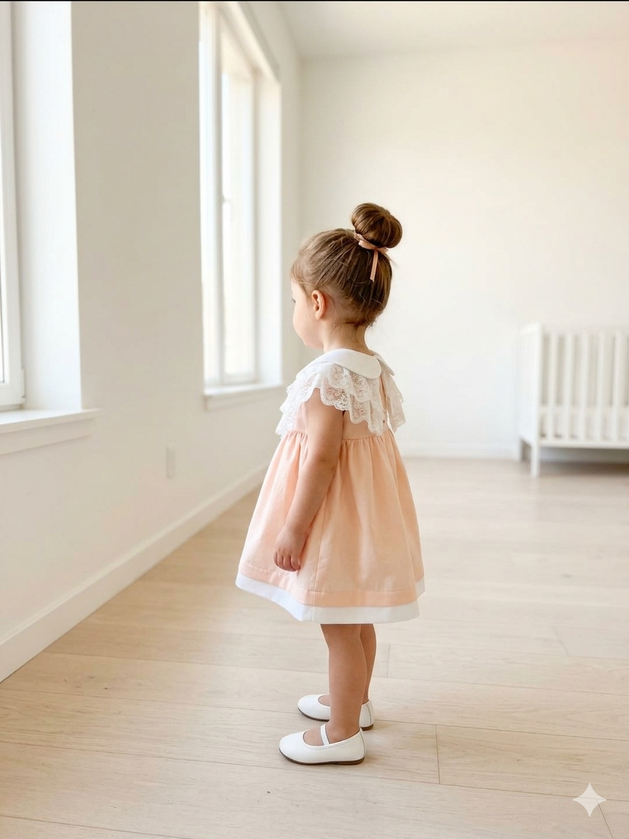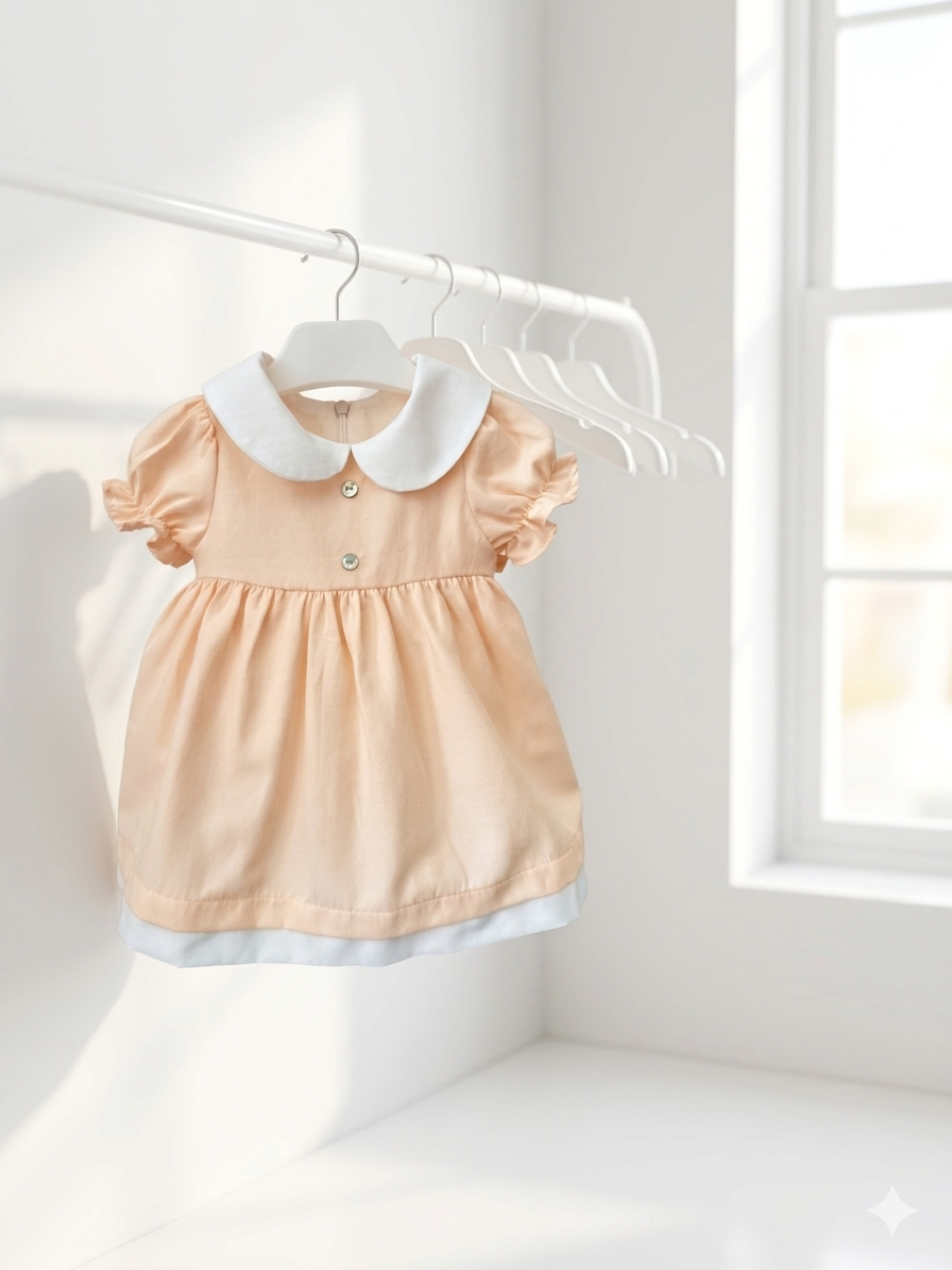 Ένα κομψό και διαχρονικό βρεφικό φόρεμα σε απαλό ροδακινί χρώμα, ιδανικό για τις πιο ξεχωριστές στιγμές, όπως η πρώτη εμφάνιση ή η βάπτιση. Το σχέδιο ξεχωρίζει για τον ρομαντικό του χαρακτήρα, με στρογγυλό λευκό γιακά και διακριτικά κουμπάκια στο μπροστινό μέρος που προσθέτουν μία πινελιά κομψότητας.