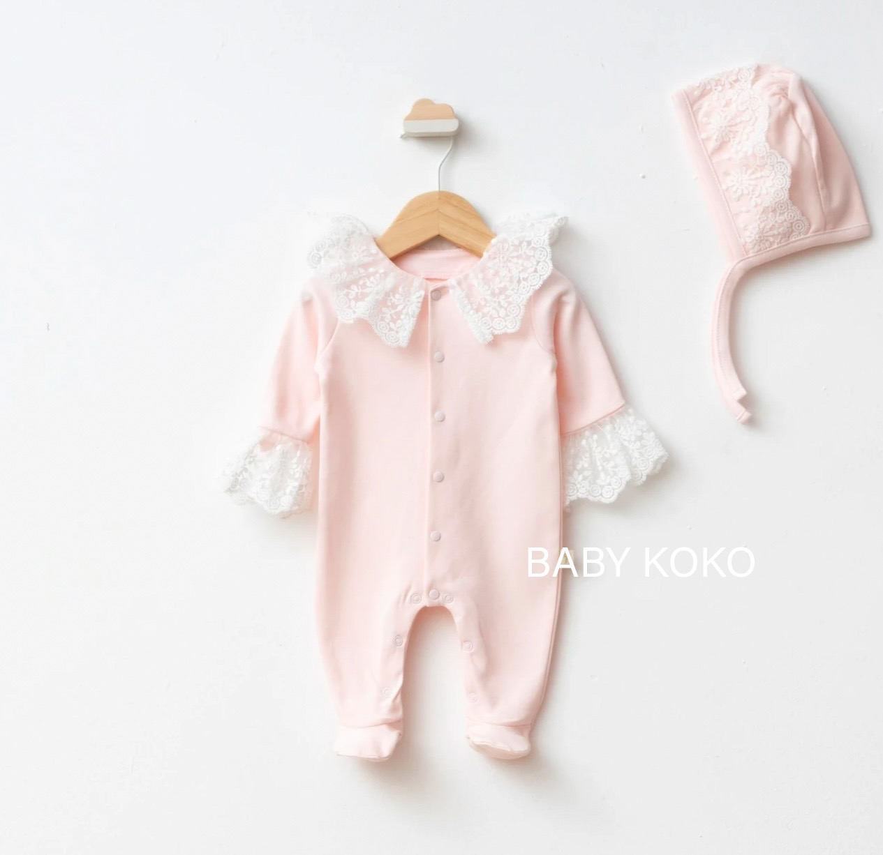 Ρομαντικό Βρεφικό Φορμάκι Ροζ με Δαντελένια Λεπτομέρεια & Σκουφάκι